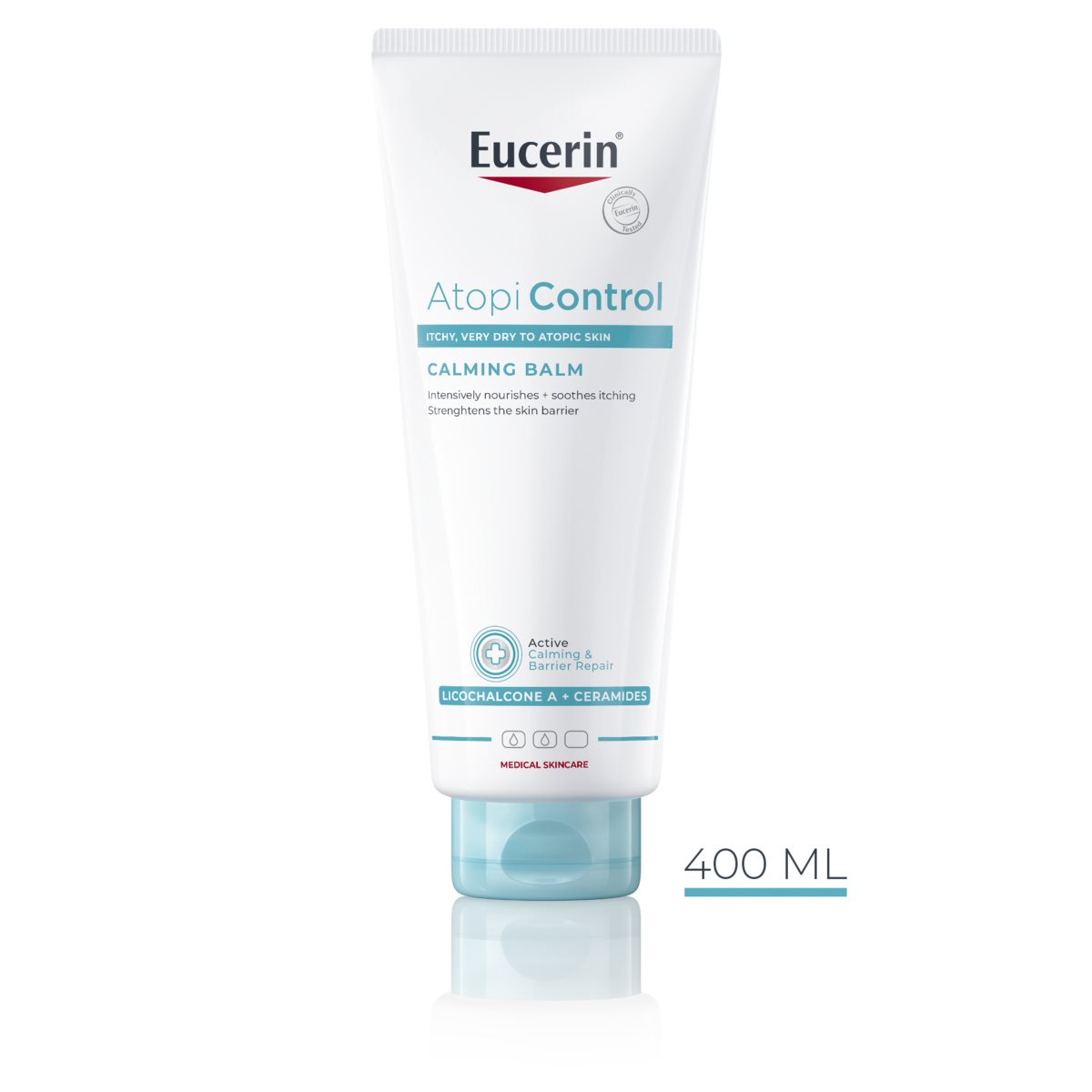 Eucerin AtopiControl Calming Balm is a daily-use body balm that has been specially formulated to soothe and intensely moisturize irritated and itchy skin. The light but nourishing oil-in-water balm is enriched with soothing Licochalcone A, Ceramides and Shea butter to strengthen skin’s barrier and relieve dryness and itching. It should also be used during a flare-up alongside Eucerin AtopiControl Acute Care Cream, Eucerin Anti-Itch Spray and your usual medication. The atopic eczema balm provides instant moisture to make skin soft and smooth and, with regular application, skin condition noticeably improves.