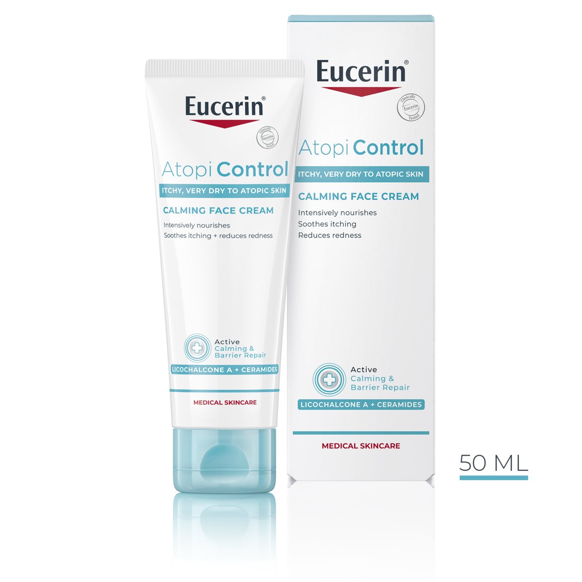 Eucerin AtopiControl Calming Face Cream has been specially formulated to provide basic daily care for atopic skin and can be used during flare-ups as well as in the calmer periods between. It is clinically and dermatologically proven to hydrate, soothe and reduce dryness. The Eucerin eczema face cream uses a non-sticky formula that is enriched with Licochalcone A and Ceramides to strengthen skin’s barrier and relieve tightness and itchiness. Skin feels soft and smooth and, with regular use, the cream improves skin condition.
