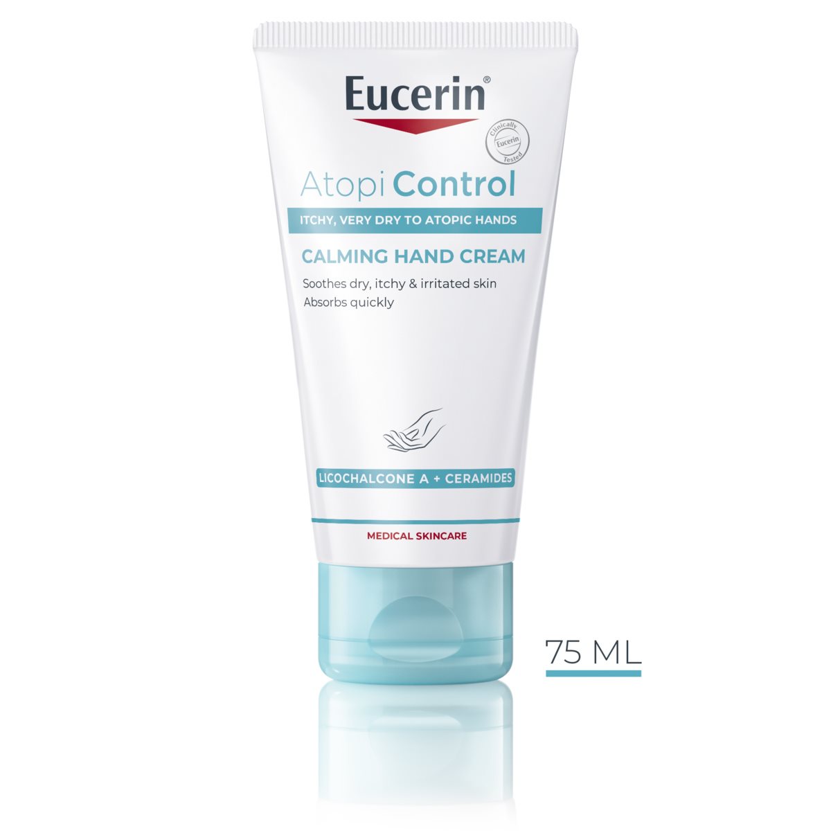 Eucerin AtopiControl Calming Hand Cream smoothes and soothes skin. The quick-absorbing and non-greasy formula has a unique active ingredient complex of soothing Licochalcone A, anti-bacterial Decanediol and itch-relieving Methoxypropanediol (MPD). This complex, combined with a high concentration of Ceramides and Avena Sativa (Oatmeal), works as a strong moisturizer for hand eczema, strengthens the skin’s barrier, alleviates dryness and relieves the sensation of itchiness.