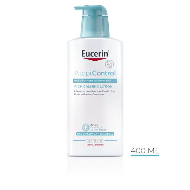 Eucerin AtopiControl Rich Calming Lotion is a daily-use eczema lotion that has been specially formulated to soothe and intensely moisturize irritated and itchy skin. The easily-absorbed, water-in-oil lotion is enriched with soothing Licochalcone A, Ceramides and Omega Oils to strengthen skin’s barrier, relieve dryness and itching and prolong the period between flare-ups of Atopic Dermatitis. With regular application skin condition noticeably improves and skin feels soft and smooth.