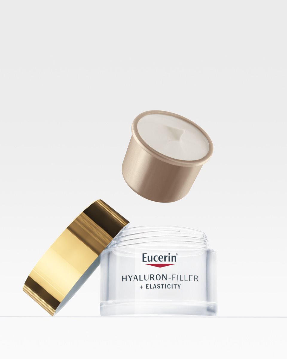 This HYALURON-FILLER + ELASTICITY Night Refill contains 90% less plastic compared to to the regular Eucerin Face Care jar. By using this refill, you can help to reduce plastic waste and contribute towards a more sustainable product cycle. Compatible with all Eucerin Face Care jars.
