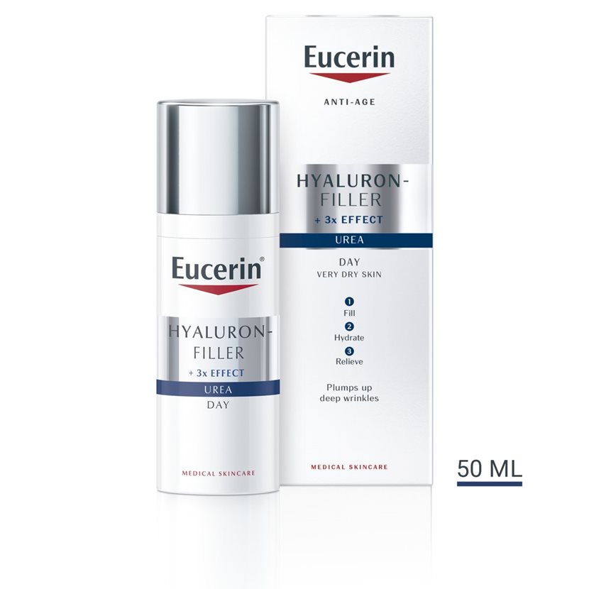 In addition to moisturising Urea and wrinkle-reducing Hyaluronic acid. Eucerin Hyaluron-Filler + Urea Night contains Ceramide-3 which regenerates the skin overnight. Eucerin Hyaluron-Filler + Urea Day also contains Urea and Hyaluron.