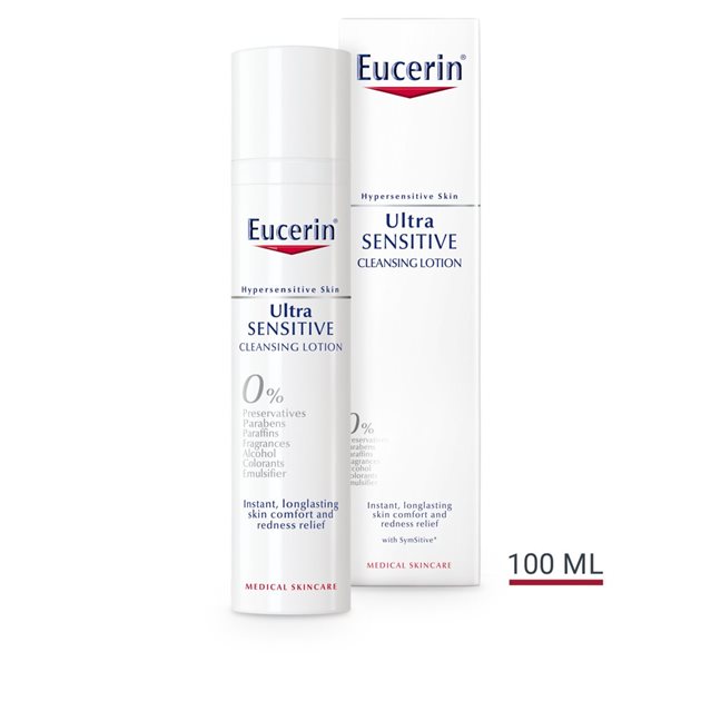 Eucerin UltraSENSITIVE Cleansing Lotion contains SymSitive*, an innovative active ingredient especially developed for hypersensitive skin. It acts as a sensitivity regulator at the source of the hyper-reactivity, minimising sensory fibre activation and, in turn, soothing hypersensitivity instantly. Eucerin UltraSENSITIVE Cleansing Lotion instantly calms and soothes irritation and relieves redness, making it a fundamental part of the daily care routine for hypersensitive skin. Following cleansing, use Eucerin UltraSENSITIVE Soothing Care Dry skin or Eucerin UltraSENSITIVE Soothing Care Normal to combination skin when the dominant skin problem is an unpleasant skin feel such as burning, stinging or itching. If skin shows visible signs of redness, there are signs of inflammatory skin diseases like Rosacea, or if an SPF is wanted, use Eucerin AntiREDNESS Soothing Care or Eucerin AntiREDNESS Concealing Day Care SPF 25. As with all products in the Hypersensitive Skin ranges, Eucerin UltraSENSITIVE Cleansing Lotion uses anti-contamination packaging with a dual valve system. * =reg.tm of Symrise AG, Germany