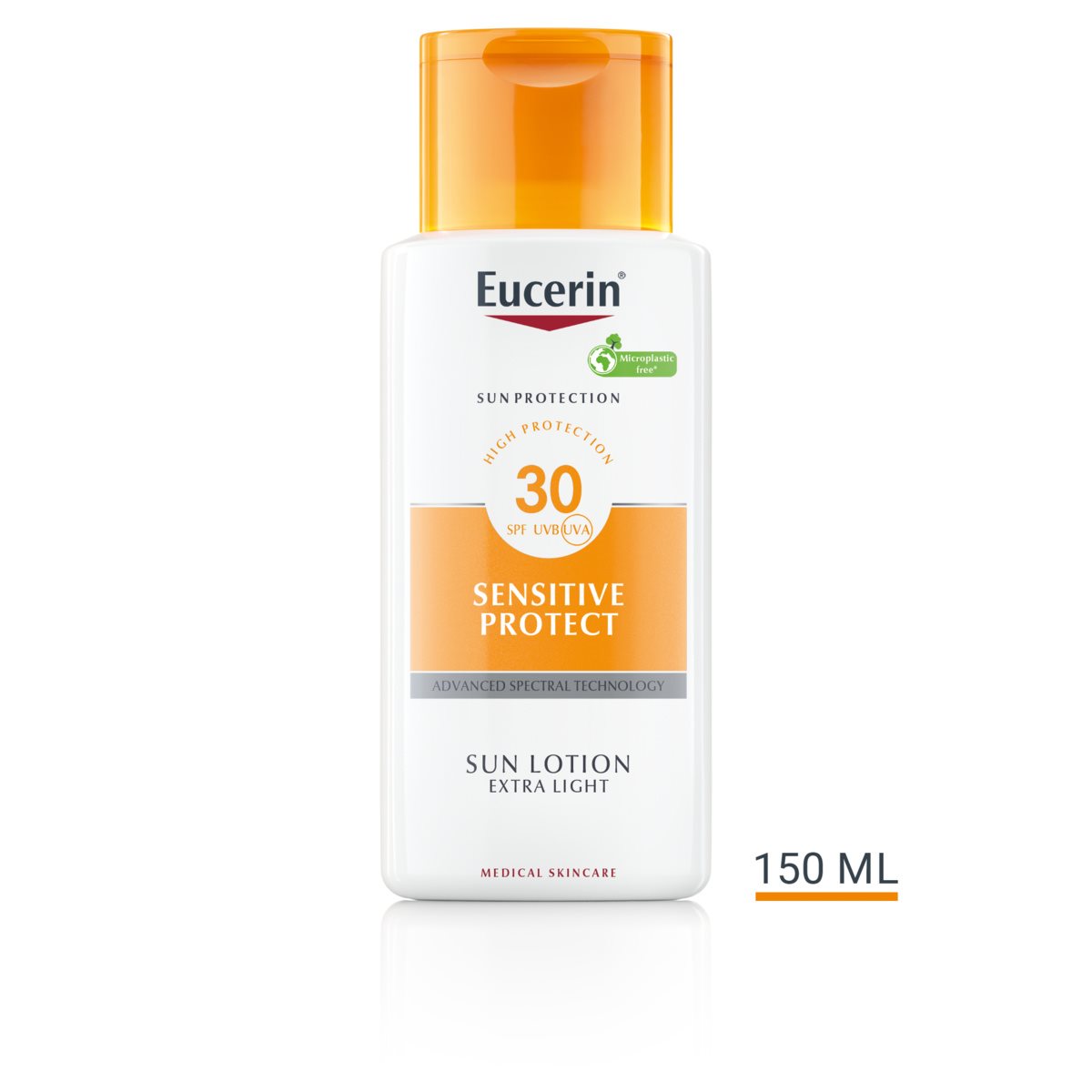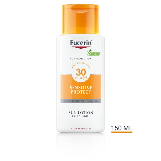 UV light is the main cause of sun-induced skin damage, but high-energy visible (HEVIS) light can also trigger free radicals that cause further stress to skin. Eucerin Sun Body Sensitive Protect Extra Light Lotion SPF 30 is a sunscreen for the body that soothes sensitive skin and protects it from sun-induced skin damage. It is also suitable for atopic skin. The Advanced Spectral Technology combines broadband and photostable UVA and UVB filters1 for very high UV protection with Licochalcone A. This powerful antioxidant works to neutralize free radicals caused by UV and HEVIS light. The extra-light sunscreen body lotion absorbs immediately and is water-resistant. Eucerin Sun Body Sensitive Protect Extra Light Lotion SPF 30 is clinically and dermatologically proven to be suitable for sensitive skin including skin with Atopic Dermatitis.