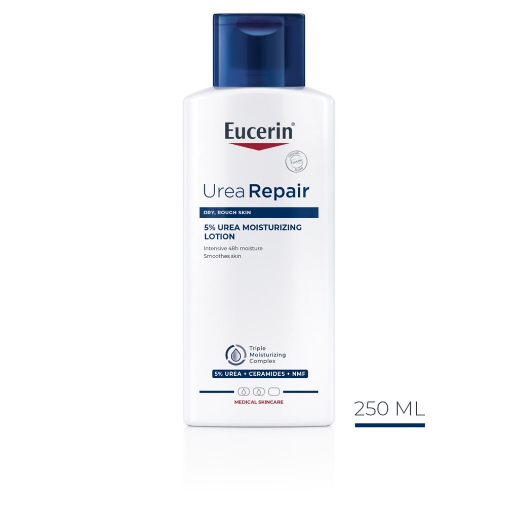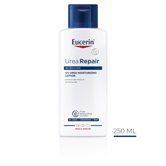 Eucerin’s UreaRepair 5% Urea Intensive Moisturizing Lotion contains Urea and other Natural Moisturizers (to bind water into the skin) and Ceramides (to repair the skin barrier and reduce moisture loss). The formula gives immediate relief and delays the symptoms of very dry skin (such as roughness and scaliness) for up to 48 hours.